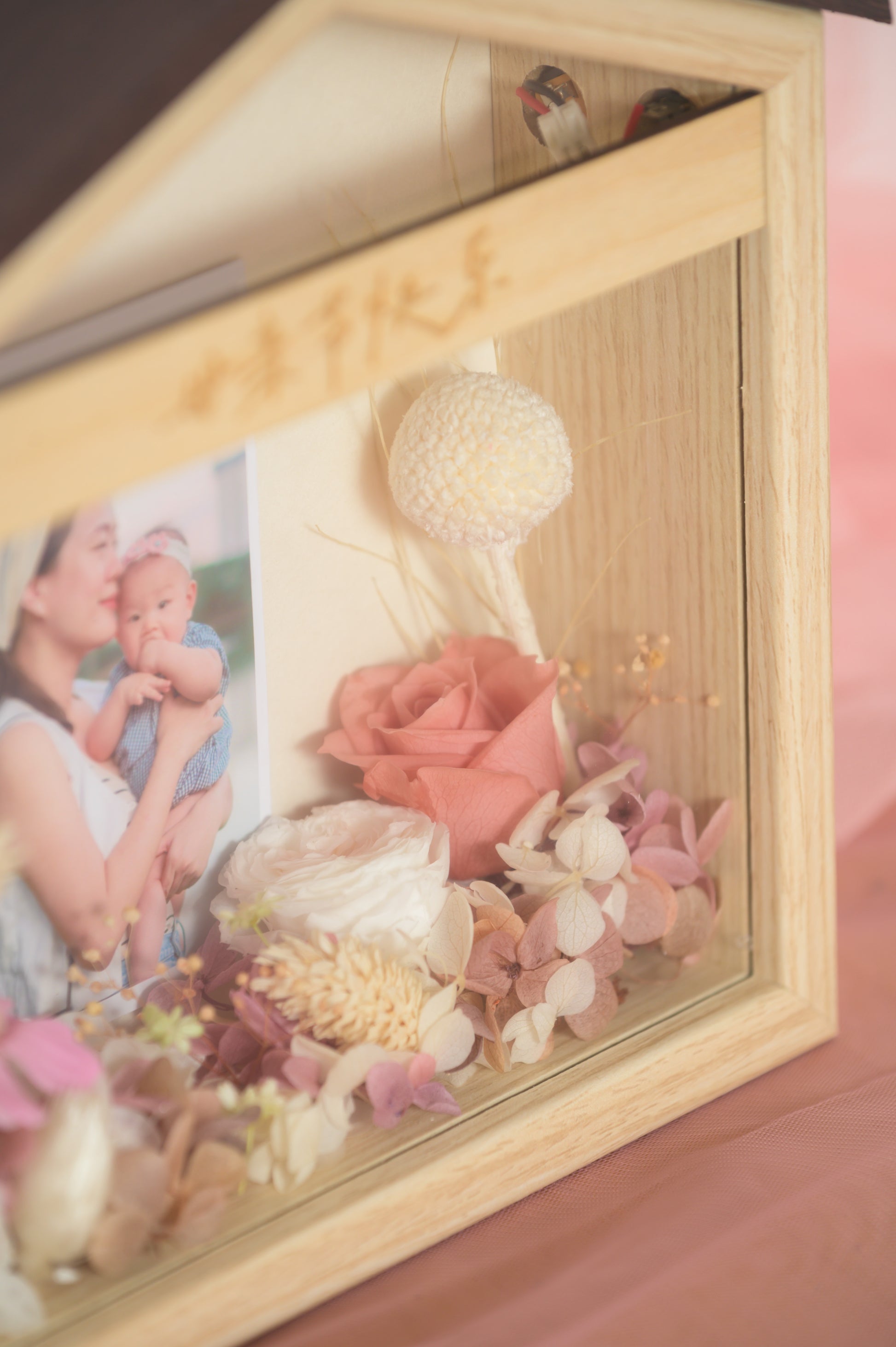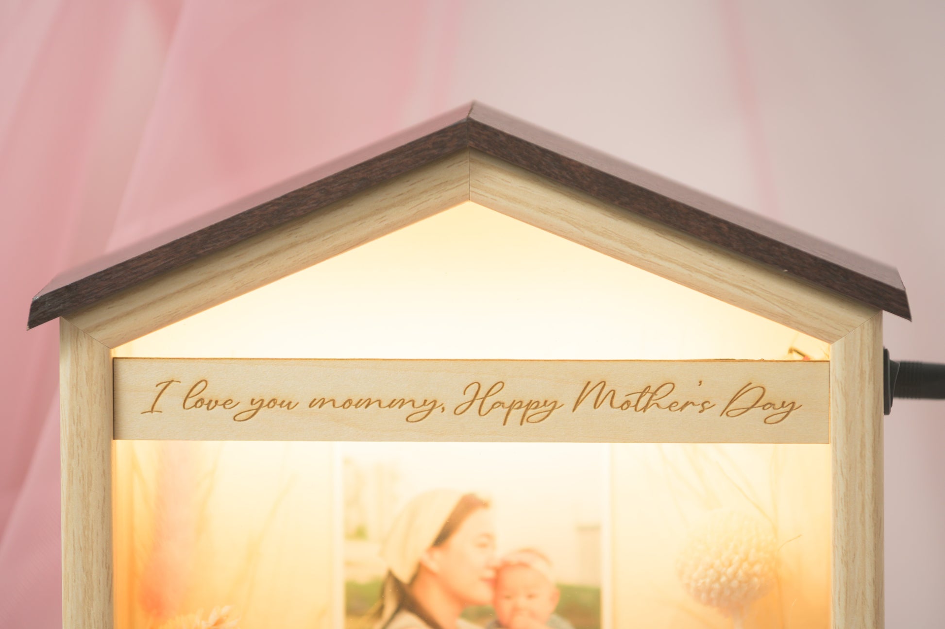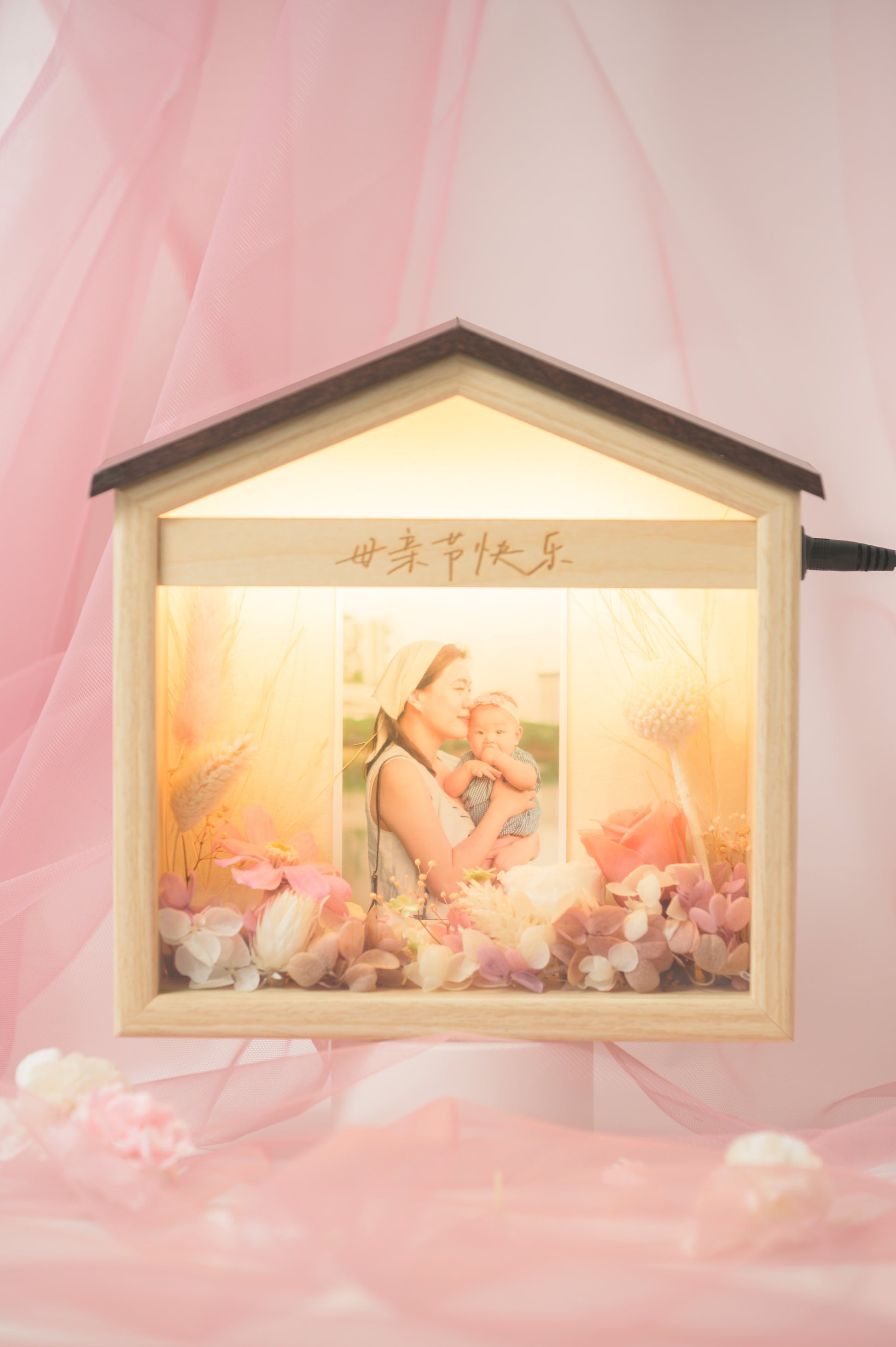 Celebrate mum with our latest customizable photo keepsake โ featuring a glowing acrylic panel softly lit from a wooden base, framed with elegant preserved flowers.
